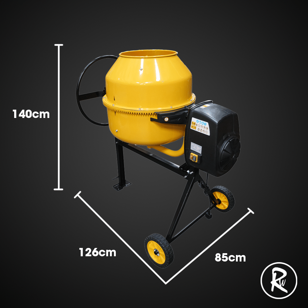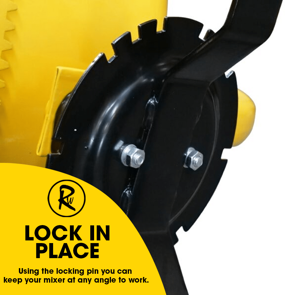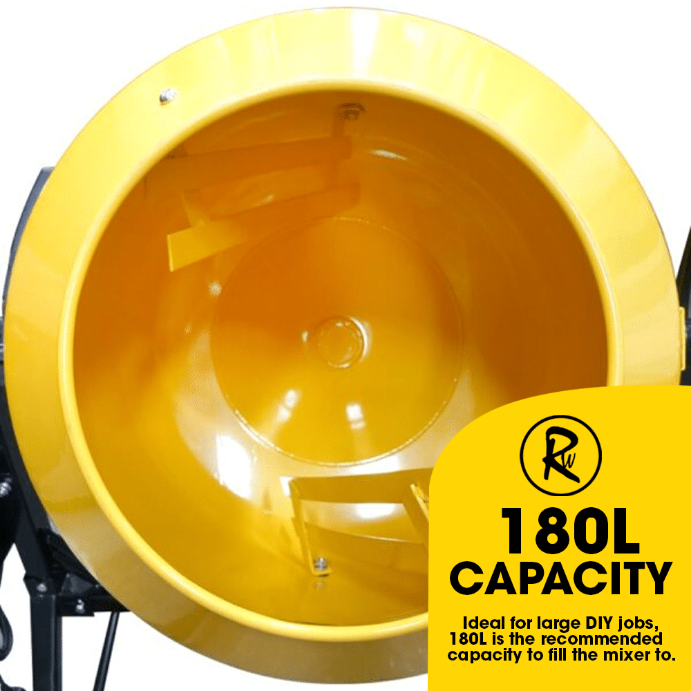 The drum spins at 29.5 turns per minute, and it holds 180 litres (recommended filling capacity 175 Litres), which makes the job quicker and easier than hand-mixing the cement. It also features a turning wheel on the side of the mixer to allow for you to easy tip out the cement from the mixer without a struggle to get it out.